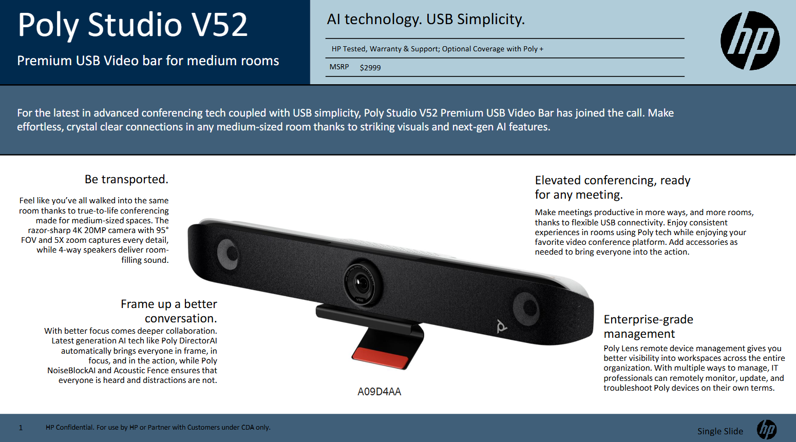HP Poly Studio A2 sets a new standard for conference room audio with a modular, plug-and-play design that delivers exceptional sound quality, scalable performance, and easy setup for Poly’s next-generation video solutions. It expands audio coverage without the cost or complexity of traditional installations, offering precise voice capture, clear audio, and a consistent experience across Poly platforms. Easy to install, manage, and reconfigure, Studio A2 is ideal for a wide range of spaces and for organizations seeking a sustainable, centrally managed, best-in-class AV solution under one trusted brand.
